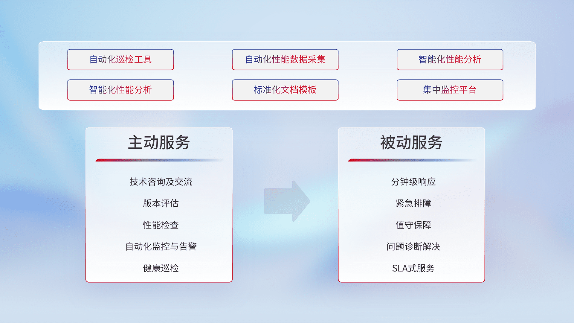智能化工具和标准化文档,,,,保障服务质量,,提供主动服务(包含技术咨询、、版本评估、、性能检查、、、自动化监控与告警、、、健康巡检)和被动服务包含(分钟级响应、、紧急排障、、、值守保障、、、、问题诊断解决、、、SLA服务)。。。