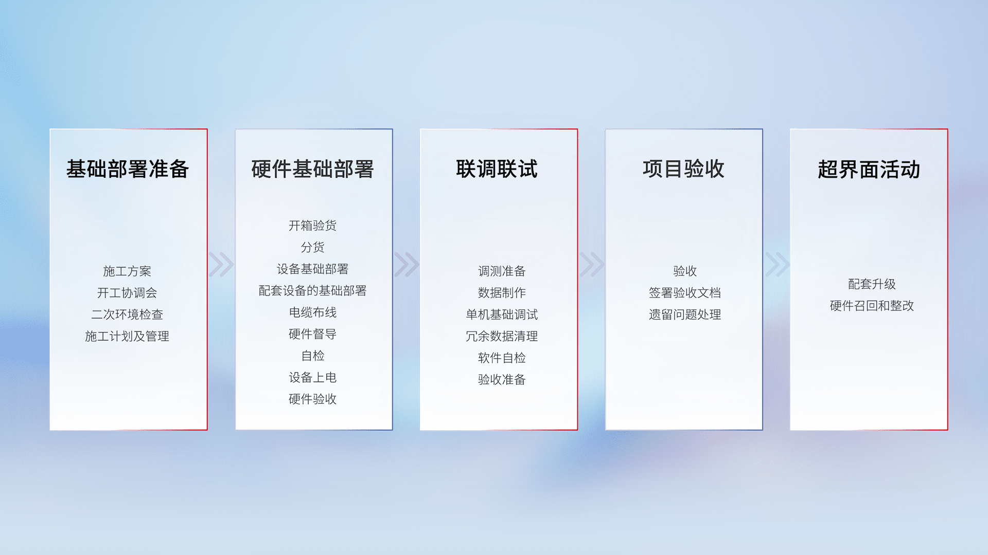 从基础部署准备、、硬件基础部署、、、、联调联试、、、、项目验收、、越界面活动的全过程可追溯,,保证施工质量和进度。。。
